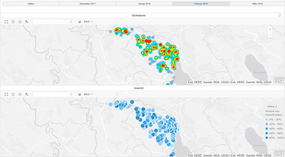 Auf der Grundlage von Postleitzahlen wurden Geo-Koordinaten erstellt, mit welchen Informationen, wie beispielsweise der Umsatz pro Produkt, auf der Schweizer Karte visuell dargestellt werden konnten. Selbstverständlich kann dabei der entsprechende Zeitraum, wie der Tag, die Woche, der Monat oder das Jahr selektiert werden.