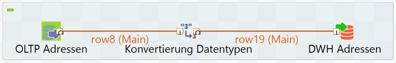 Adressen werden aus der Transaktionsdatenbank (z. B. einer ERP-Datenbank) geladen. Nachdem die Datentypumwandlung abgeschlossen ist, werden die Datensätze ins DWH geschrieben.