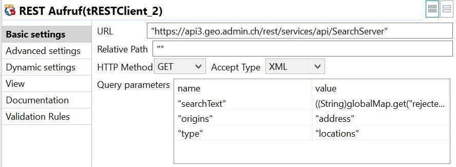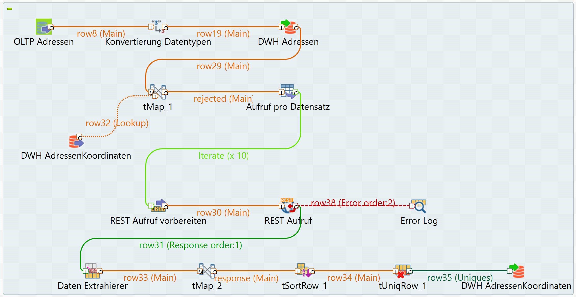 Anschliessend werden diese Datensätze extrahiert, mit tMap in das gewünschte Format umgewandelt und sortiert. Es kann passieren, dass von der REST-API mehrere mögliche Koordinaten zurückgegeben wurden. Sobald dieser Vorgang abgeschlossen ist, kann der gewünschte Datensatz ausgewählt und die Datenbank beschrieben werden. Zu beachten ist, einen Anbieter auszuwählen, der eine REST-API für die Umwandlung von Adressdaten in Koordinaten anbietet.