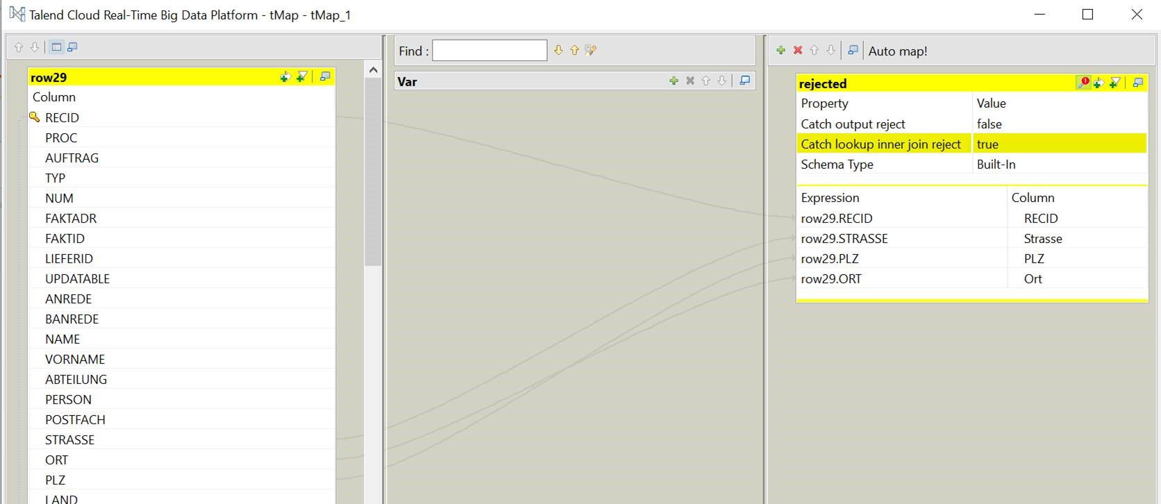 Die DHW-Adressen werden mit bereits vorhandenen Koordinaten abgeglichen. Talend bietet dazu nebst der "inner join"-Möglichkeit der Datenzusammenführung zusätzlich die "rejected inner join"-Methode an. Mit der "rejected inner join"-Methode lassen sich Daten herausfiltern, bei welchen ein "inner join" fehlschlug. In unserem Beispiel wären dies die Daten, welchen keine Koordinate zugewiesen wurde.