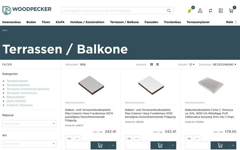 Der Onlineshop der Woodpecker Group AG punktet mit einem breiten Sortiment. Mit intuitiven Filtermöglichkeiten bietet die Woodpecker Group AG ihren Kunden eine ausgezeichnete User Experience und präsentiert sich mit einem schön-designten Onlineshop. Trotz der enormen Menge an Produktdaten, die der Shop in Echtzeit aus dem ERP bezieht, ist er performant und reagiert sehr schnell.