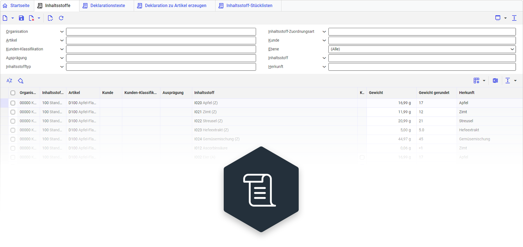 Es können mehrsprachige, deklarationsrelevante Informationen zu einem Artikel erstellt und gespeichert werden. Die relevanten Daten umfassen die Artikelbezeichnung, die Liste der Zutaten, die Kennzeichnung von Allergenen, inklusive optischer Hervorhebung in der Zutatenliste, sowie Hinweise auf Allergene, die zwischen Kontaminationen und absichtlich enthaltenen Allergenen unterscheiden. Darüber hinaus können auch Informationen zu Inhaltsstoffen wie "Kohlenhydrate" erfasst werden, welche sich zur Nährwertkennzeichnung nutzen lassen.